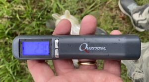 The tale of the scale as it read 2.30 on the bass caught and weighed in the video below
