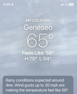 Weather: Partly cloudy/very windy, 65F