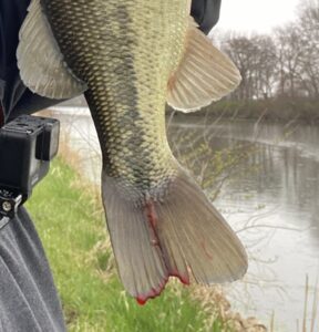 Spawning Tales/Tails – The angler above also noted observing some bass with beat up, bloody tails. I shared that I had also caught a pair with the same look over the weekend. In addition, I had spooked a half dozen bass along the shoreline on this outing as they darted of bare spots on the bottom. All the above points to the bass’ thoughts turning to making more bass in the shallow, warming water of The Canal.