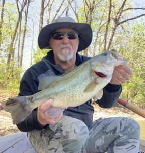 I then rowed back to the target and made two more casts. While retrieving the second cast, I observed a shad shoot out of the water nearby indicating that it was likely fleeing a predator. As a result, I made a follow-up cast in the vicinity and was rewarded with a bass weighing 1-5.