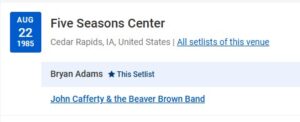 Sticking with the 1985 theme, I saw my first real concert at the Five Seasons Center in Cedar Rapids, Iowa, in the summer of ’85. Me and some guys from school took in Bryan Adams with John Cafferty and the Beaver Brown Band as the opening act. Per John Junk, one of the friends that attended the concert, the Beaver Brown Band is the lone band to be named after a color of paint (check out Wikipedia if you don’t believe John, also see Eddie and the Cruisers).