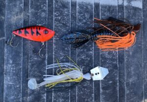 Lures: Z-Man Chatterbait (white or sexy shad) with a Yamamoto Zako (Tennessee Shad) or Bass Pro Shops Speed Shad (sight fish) trailers – 8 bass